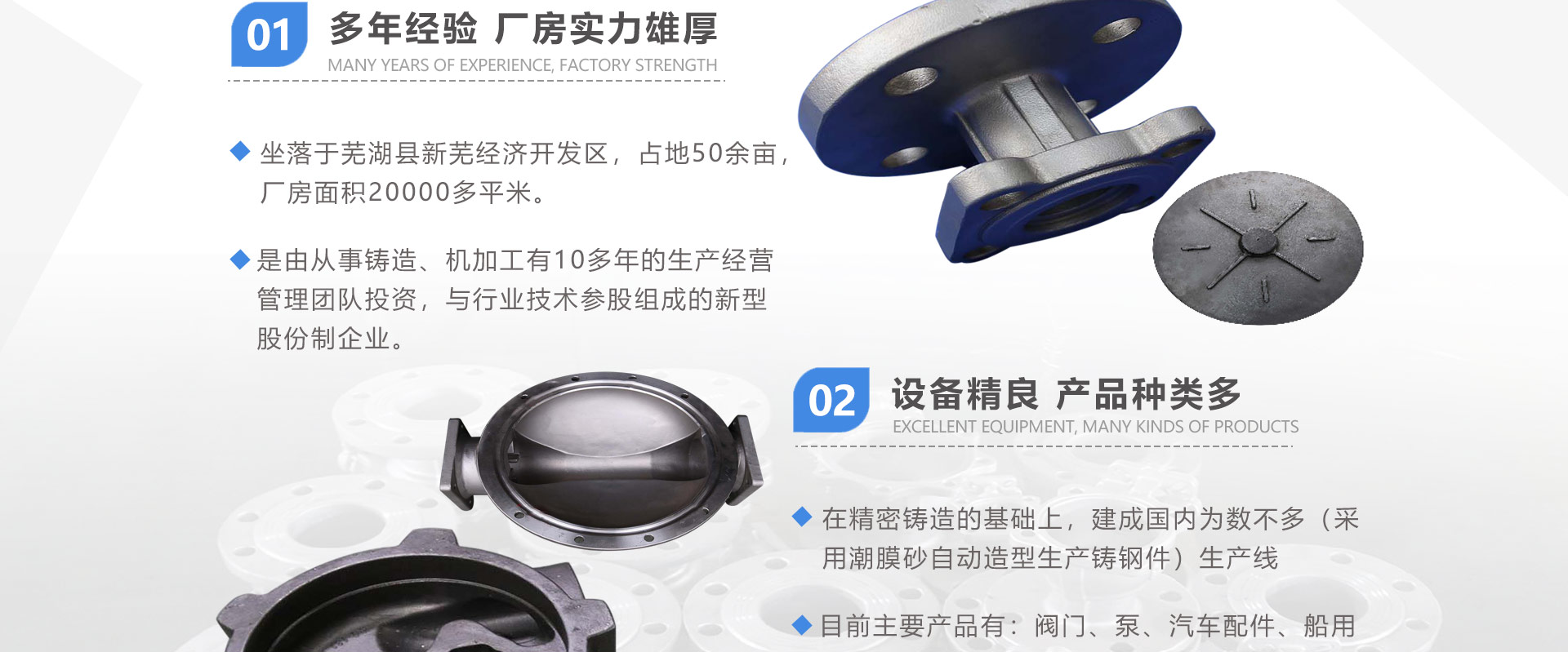 安徽偉工機械科技有限公司,坐落于安徽蕪湖新蕪經(jīng)濟開發(fā)區(qū),是一家専業(yè)從事鑄造產(chǎn)品設(shè)計、研發(fā)、生產(chǎn)、銷售于一體的企業(yè),公司為客戶的產(chǎn)品提供多樣的技術(shù)支持與設(shè)計,公司主要鑄造技術(shù)有潮模砂鑄造、硅溶膠精鑄工藝。主要產(chǎn)品有:不銹鋼閥門配件、泵閥配件、汽車配件、工業(yè)管道配件、工程機械配件、汽車配件等。材質(zhì)為:低合金鋼、304、316、316L、鉻鉬鋼、哈氏合金、碳鋼、雙相鋼等。公司已先后通過ISO9001和TS16949等多種體系審核,以完備的管理手段和齊全的檢測設(shè)備滿足客戶需求,進(jìn)的設(shè)備,専業(yè)的技術(shù),嚴(yán)謹(jǐn)?shù)墓芾恚€(wěn)定的質(zhì)量。服務(wù)客戶,鑄造未來,偉工誠摯的歡迎新老客戶共同商洽合作